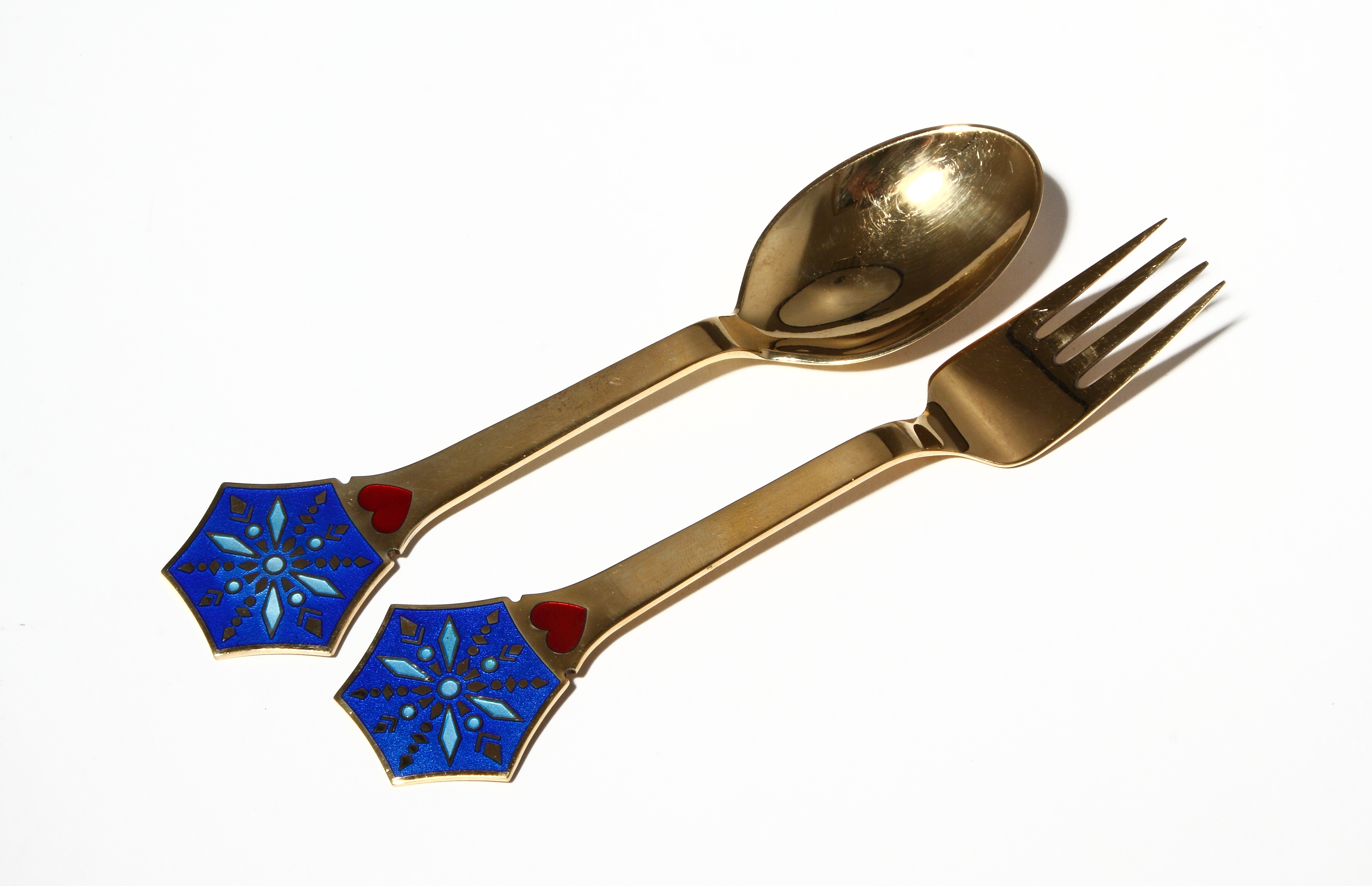 Ручки позолоченных изделий завершаются фигурным расширением, где на ярко-синем фоне