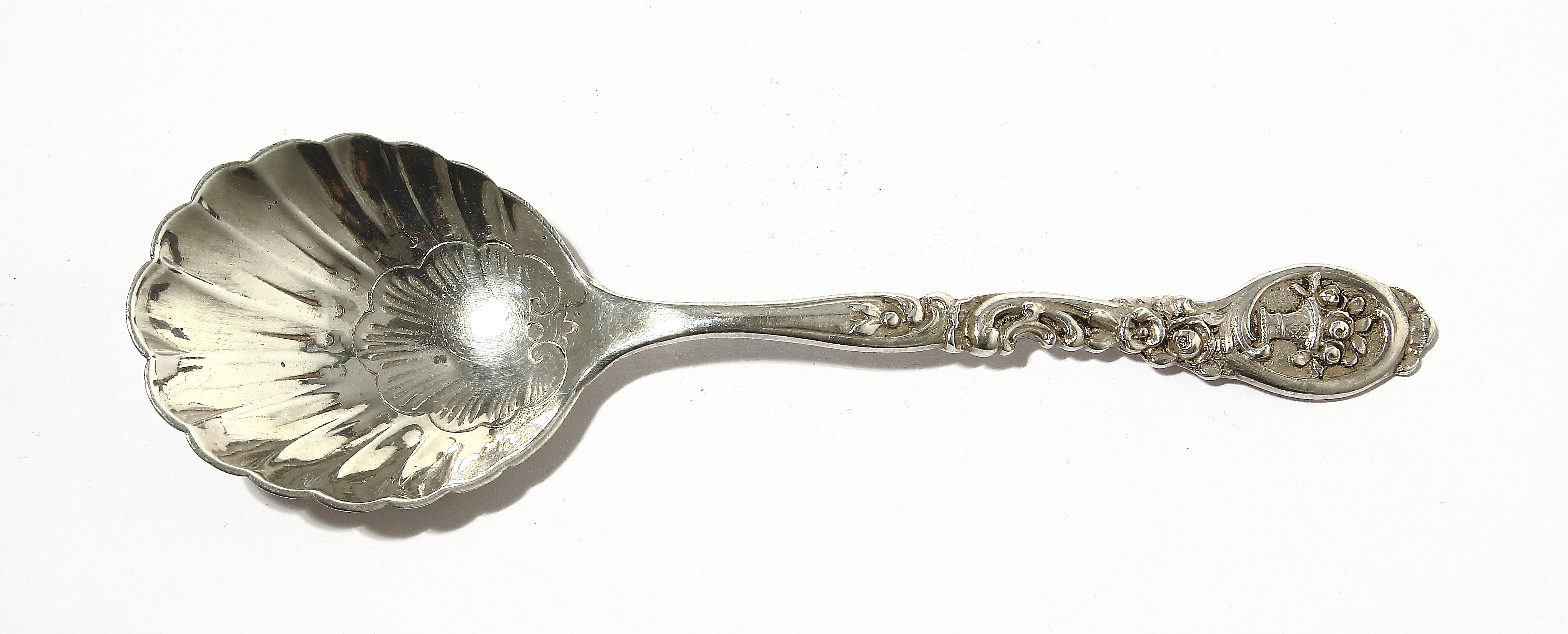 Сервировочная ложка с черпаком-ракушкой и богато декорированной ручкой.