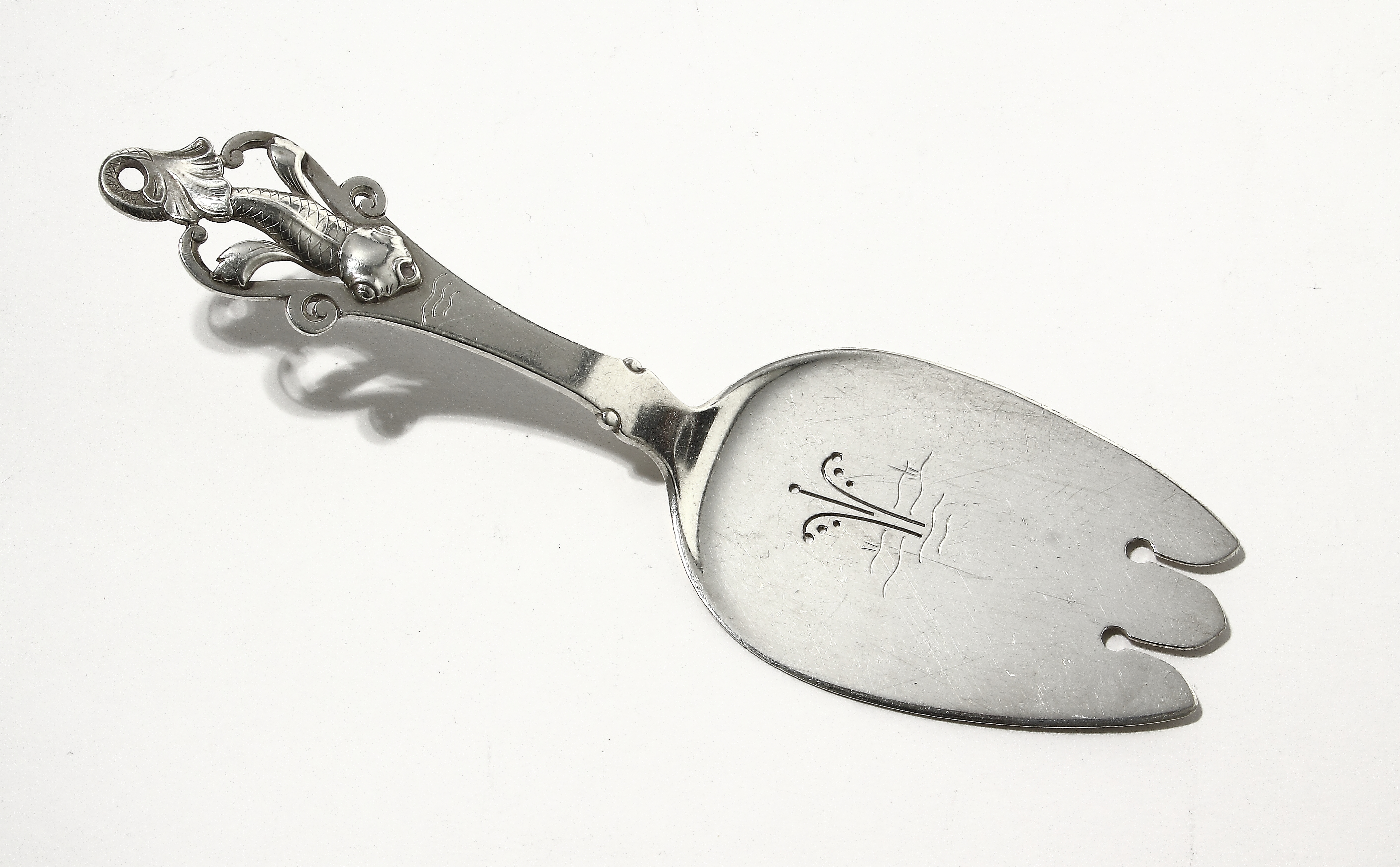 Серебряная сервировочная лопатка с рельефной рыбкой на ручке.
