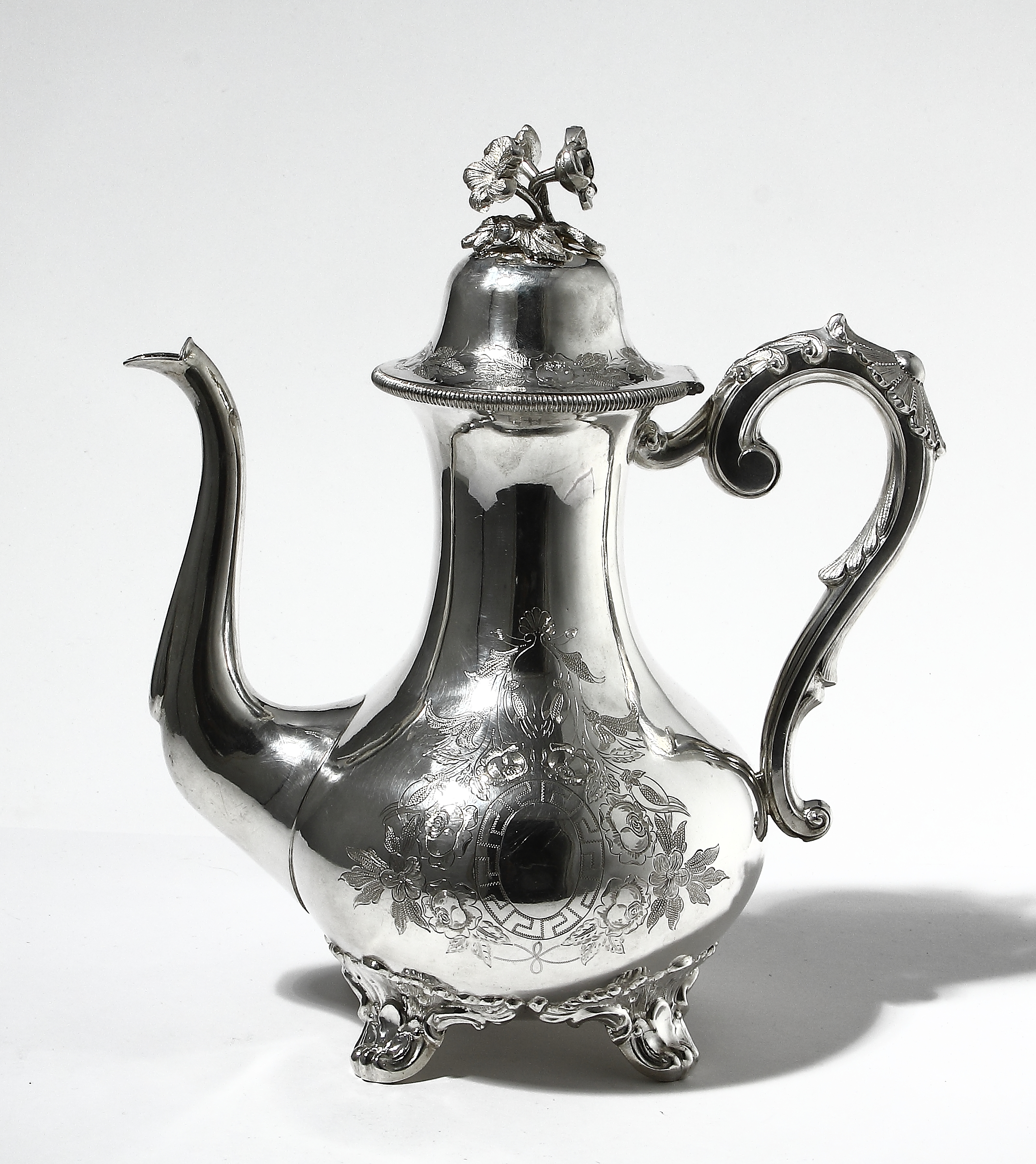 Вес - 785 граммов серебра 813 пробы. Изделие покрыто патиной. По просьбе покупателя кофейник может быть бесплатно очищен до серебряного блеска. Изделие немытое и нечищеное, покрыто патиной, которую легко очистить до серебряного блеска.