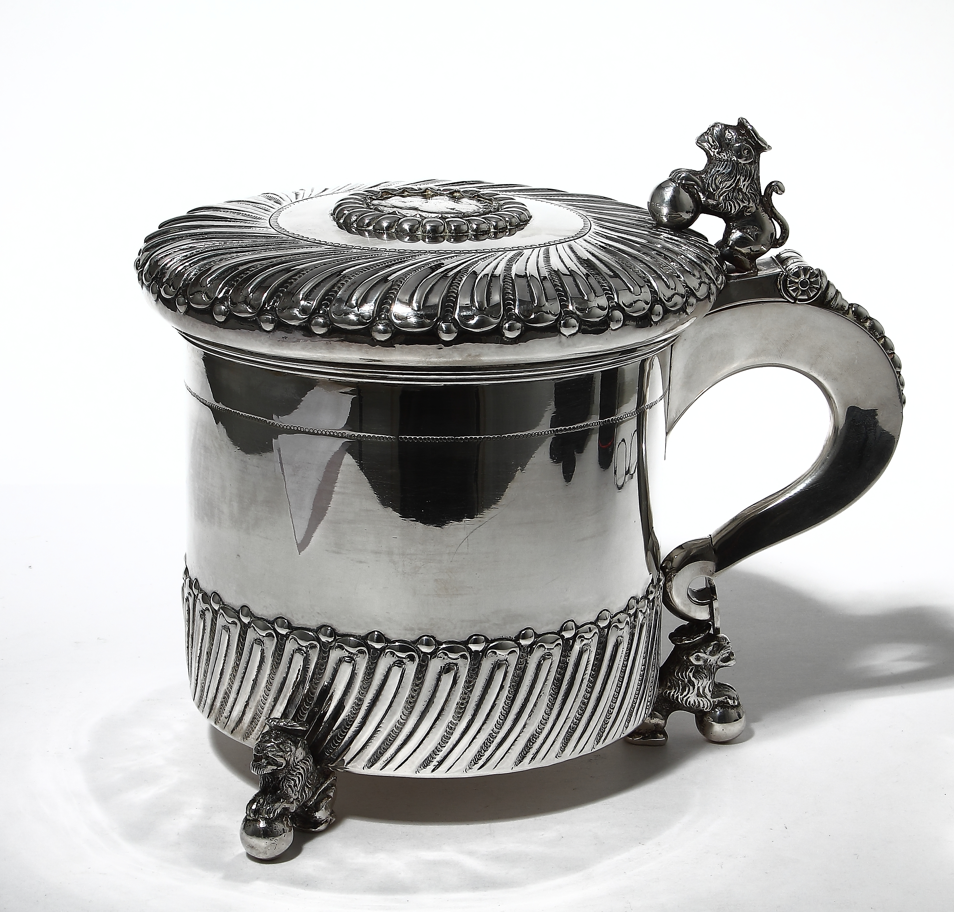 Большая серебряная пивная кружка, декорированная объемными фигурками львов.
