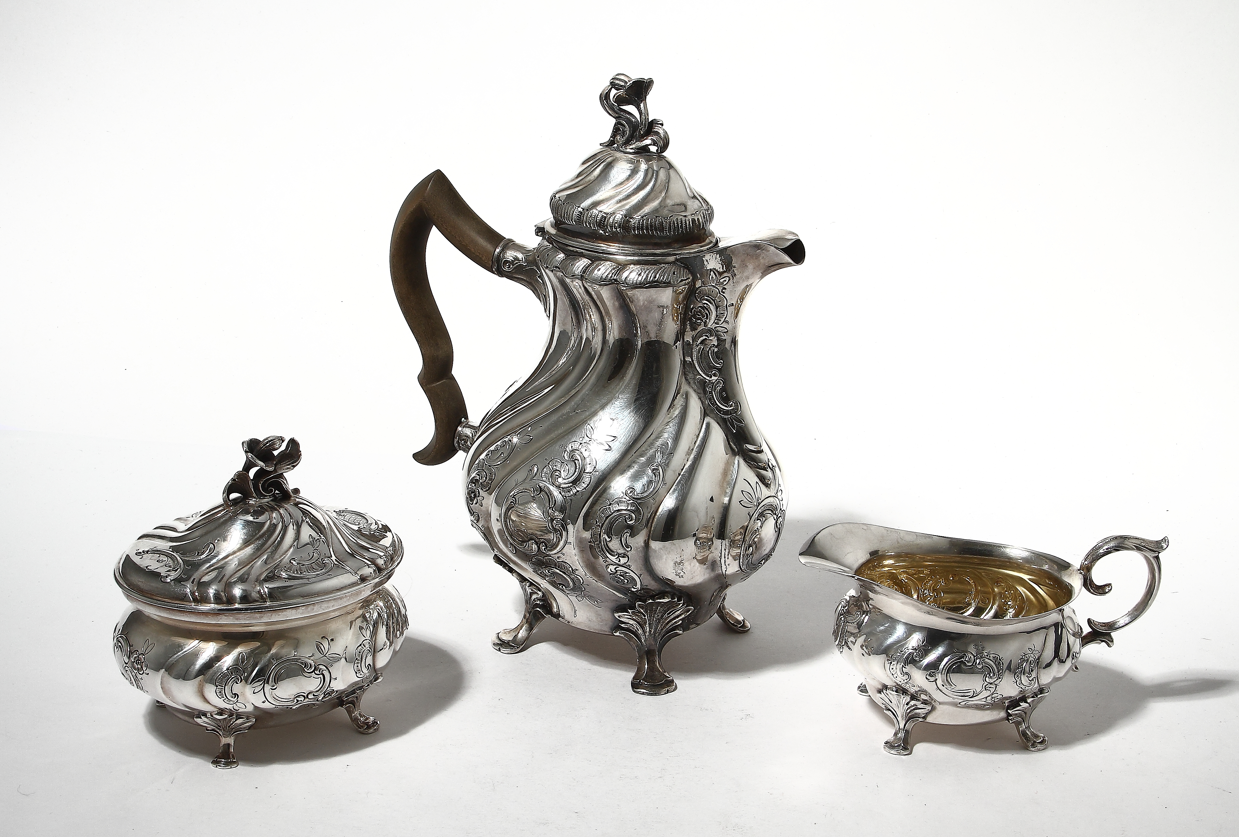 Серебряный кофейный сервиз в стиле рококо, 3 предмета: кофейник, сахарница с откиднойкрышкой и молочник.