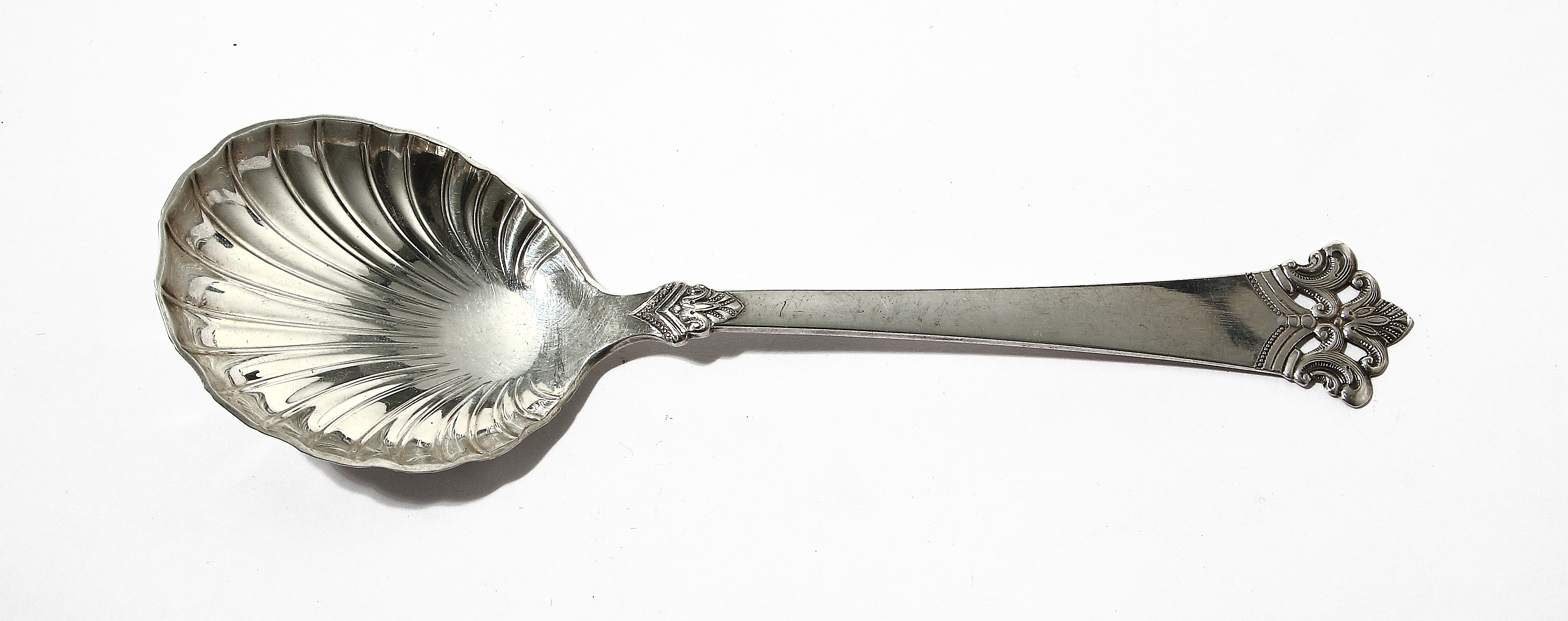 Серебряная сервировочная ложка с черпаком-ракушкой.