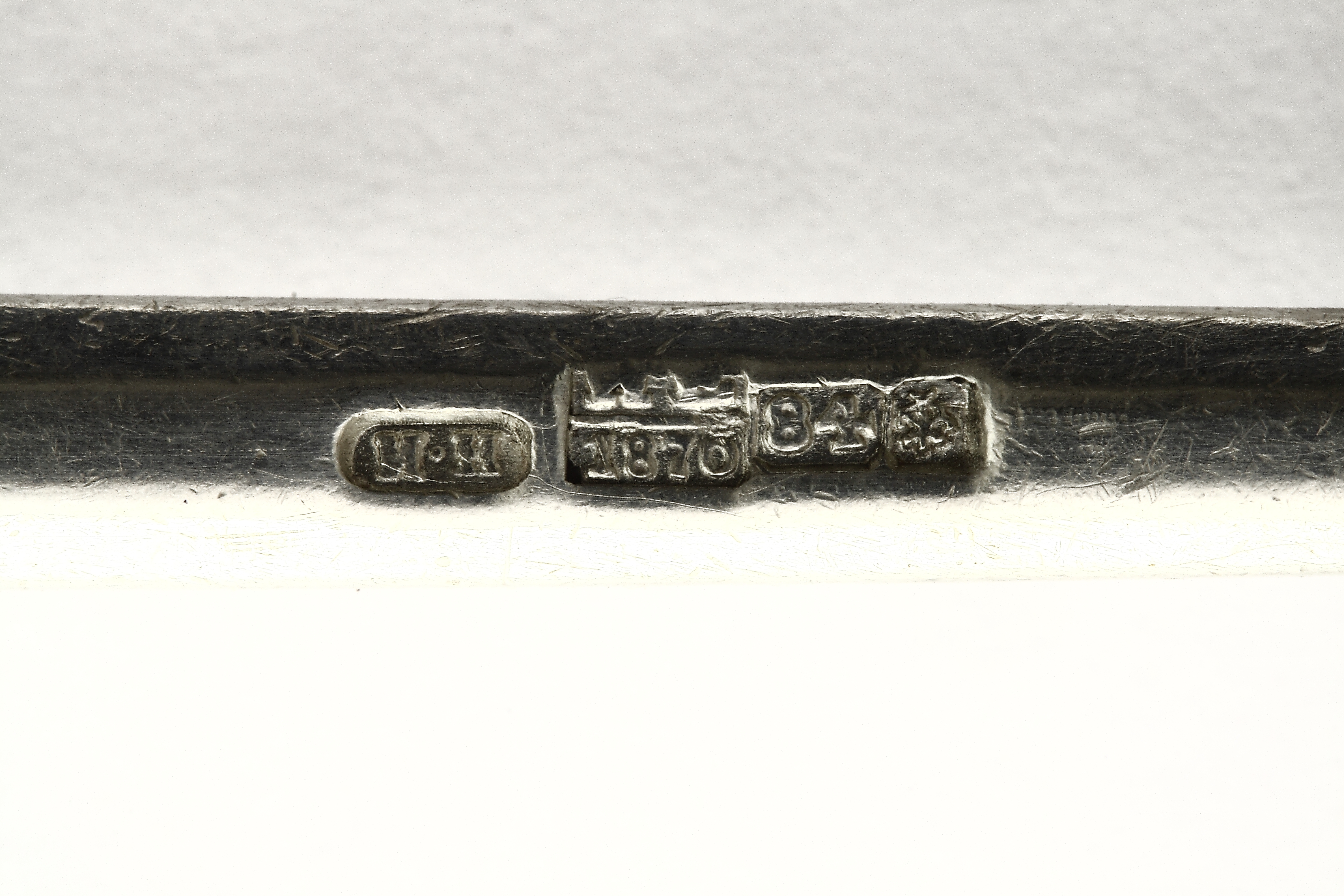 Длина - 18,5 см.Вес - 54 грамма серебра 84 золотниковой пробы (= 875 метрической пробе).