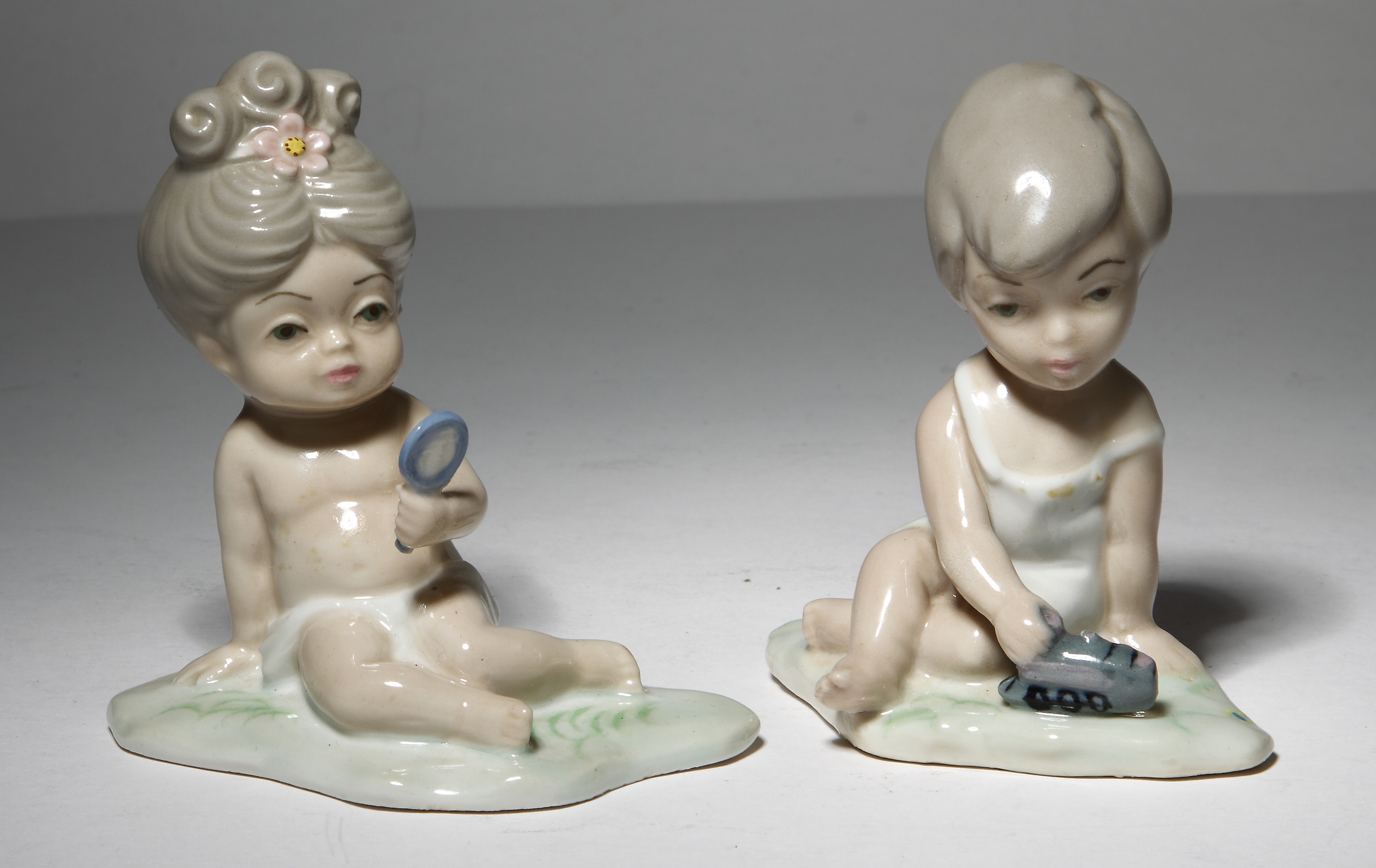Пара фарфоровых статуэток "Девочка с зеркалом" и "Мальчик с паровозиком".