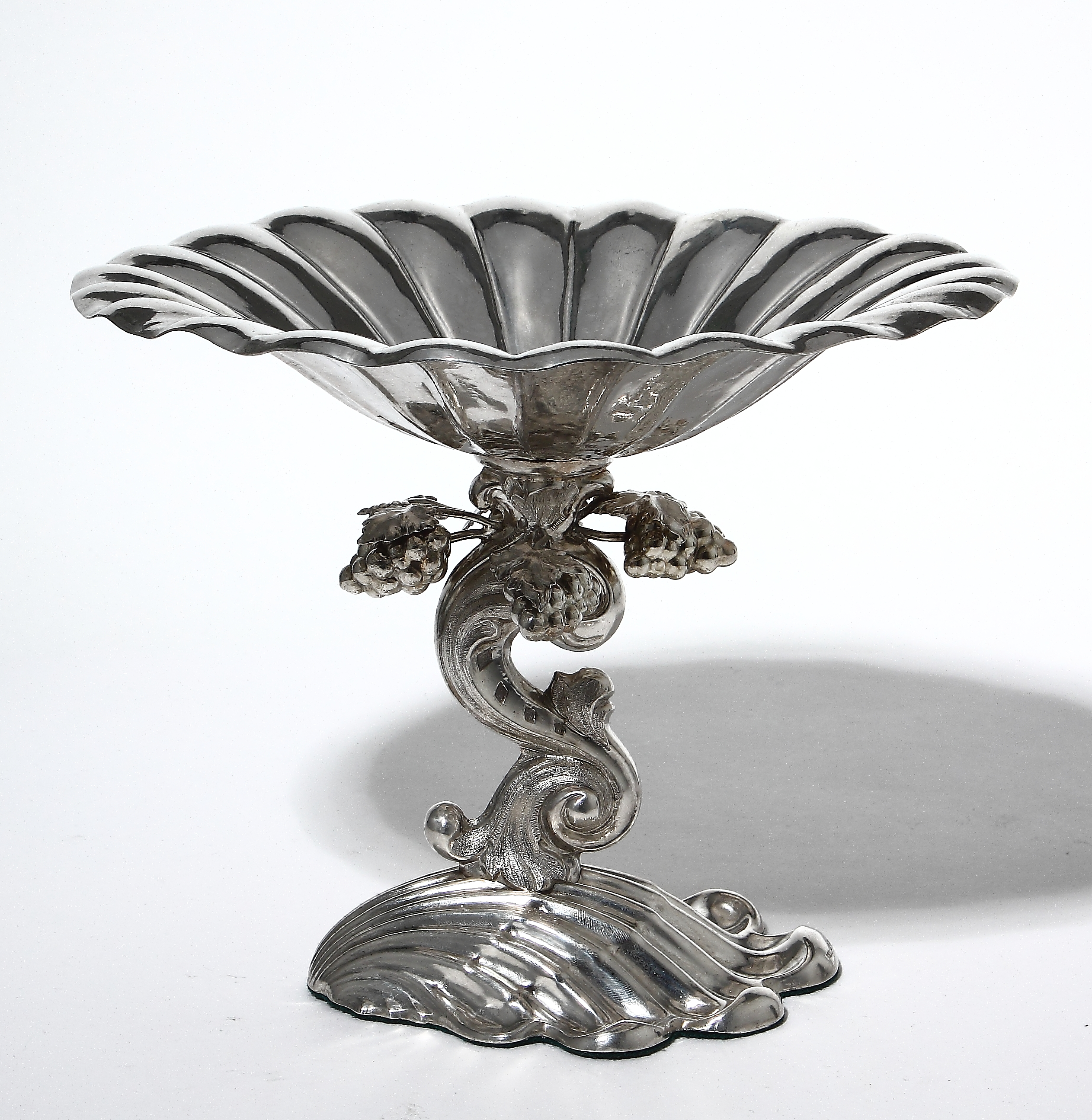 Фигурная ножка изделия, выполненная в виде завитков, декорирована объемными гроздьями винограда.