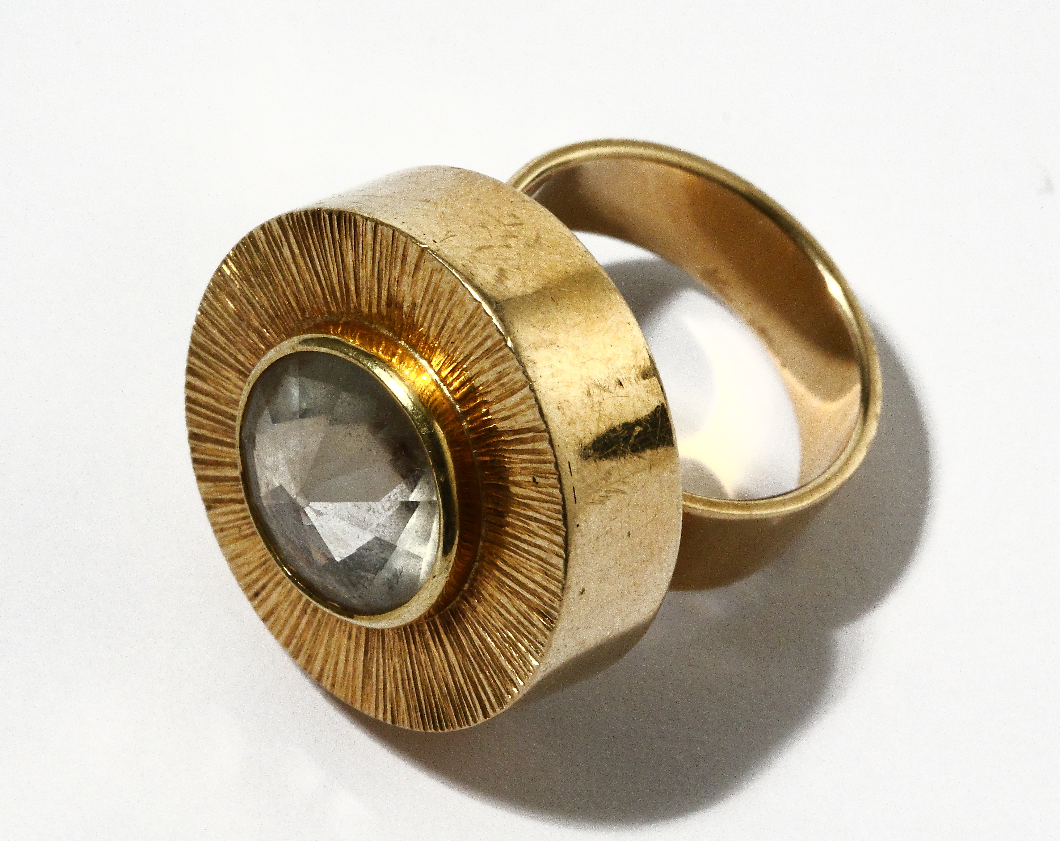 Золотое кольцо с белой прозрачной вставкой.
