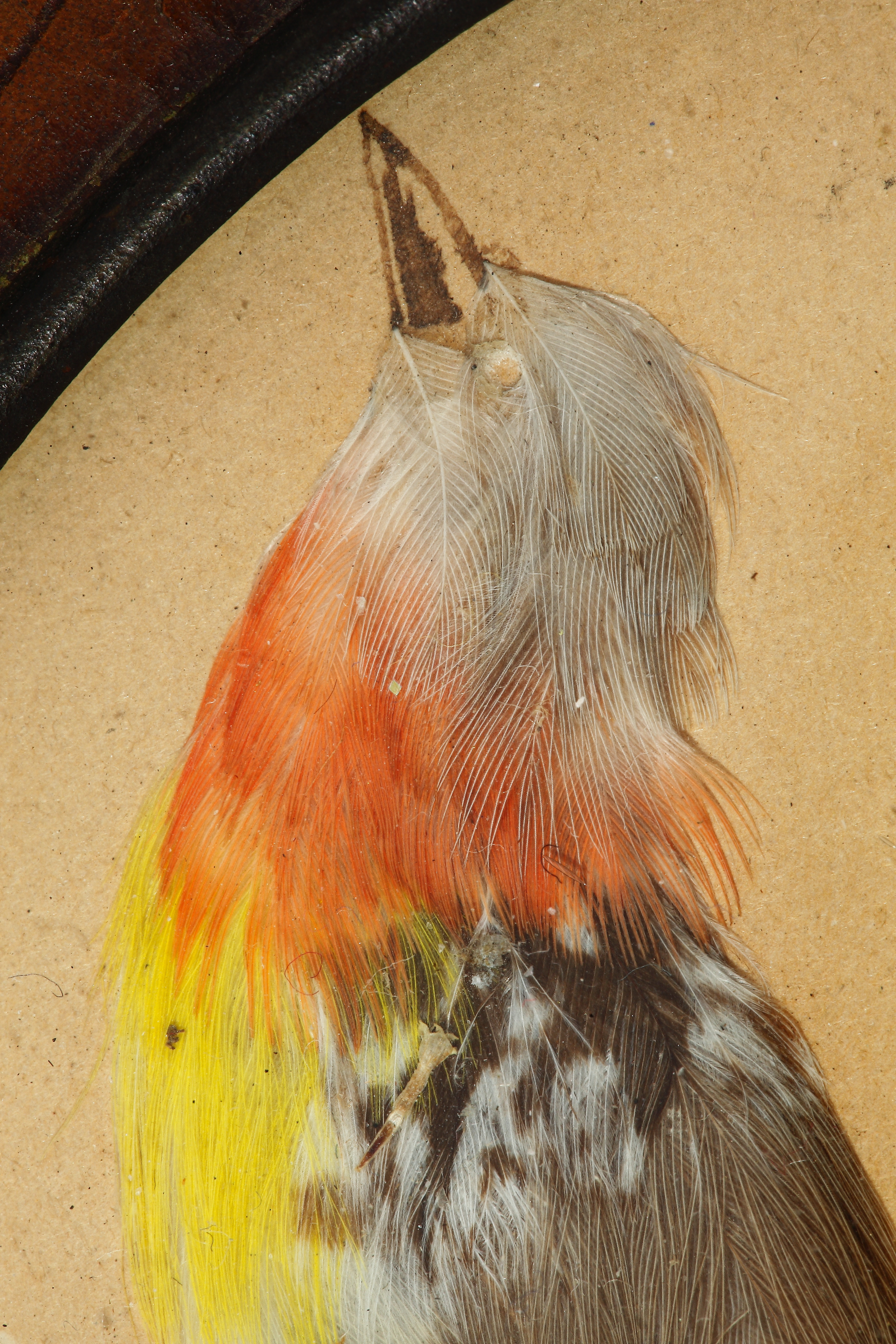 Миниатюра "Птица на ветке", выполненная из натуральных перьев экзотических птиц.