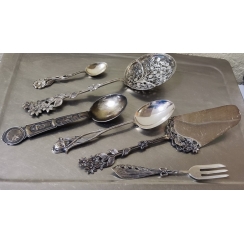 355411 - Стопка, 22 гр, 830 пр, высота 5 см, диаметр верха 5,5 см 392577 - Ситечко, 42 гр, 830 пр, длина 21,2 см 358645 - Сервировочная ложка, 55 гр, 830 пр, 24,4 см 396908 - Солонка и перечница, 89 гр, 830 пр, высота 6 см, максимальная длина 3,3 см, ширина 3,3 см