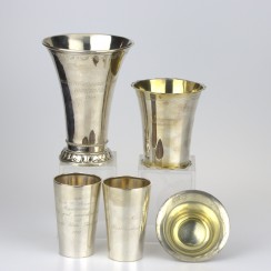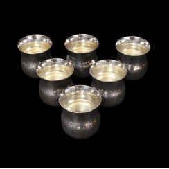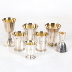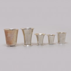 372889 - Стакан, 61 гр, 830 пр, высота 7,6 см, диаметр верха 6,8 см 307172 - Небольшой стакан в виде кубка, 49 гр, 830 пр, высота 8 см, диаметр верха 6,5 см 319895 - Стопка, 23 гр, 830 пр, высота 5,4 см, диаметр верха 5 см 285958 - Стопка в виде кубка, 20 гр, 830 пр, высота 5,2 см, диаметр верха 5,5 см 345562 - Стопка, 13 гр, 830 пр, высота 4,5 см, диаметр верха 4,3 см