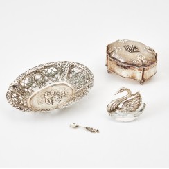 367204 - Шкатулка, 184 гр, 830 пр, максимальные размеры 10,7 х 8,5 х 6,4 см 304297 - Прорезная ваза, 93 гр, 830 пр, 17,5 х 13 х 3 см 313882 - Солонка в виде лебедя с ложкой. Стекло, серебро 835 пробы.
