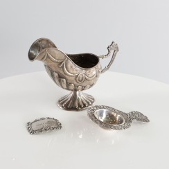 314588 - Ситечко, 50 гр, 830 пр, длина 12,5 см, максимальный диаметр 8 см 287745 - Табличка на бутылку "Виски", Англия, 14 гр, 925 пр, размеры 6 х 4 см, длина цепочки 16 см 384409 - Молочник, 174 гр, 800 пр, максимальная высота 13 см, длина 18 см, Германия