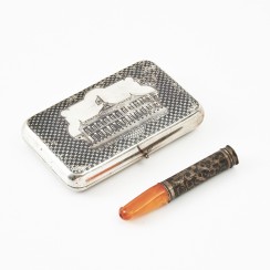 385248 - Портсигар, Российская иперия (Россия), 173 гр, 84 пр, 12 х 7,5 х 2,4 см 368635 - Мундштук. Российская империя (Россия), общий вес 15 гр, серебро 84 пр. Длина 9,5 см, диаметр отвертия под сигару 1,3 см