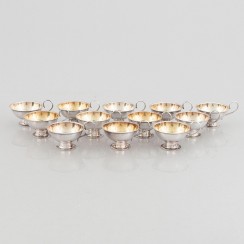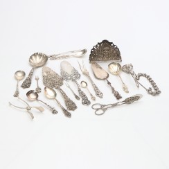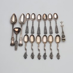 354401 - Небольшие чайные ложки, 5 шт, 55 гр, 830 пр, 11,5 см 283993 - Кофейные ложки, 5 шт, Хильдесхаймская роза, 55 гр, 830 пр, 10,3 см 282915 - Серебряные чайные ложки, 6 шт. Швеция, 1947 год. 380525 - Серебряные подставки под стопки, 2 шт. Швеция 1960 год 296291 - Серебряные подставки под стопки, 3 шт. Швеция 1956 год 224262 - Серебряная сервировочная лопатка. Швеция, 1952 год 192624 - Брошь, 11 гр, 830 пр, максимальная длина, включая подвеску, 7 см, ширина 5,5 см 366442 - Серебряные кольца для салфеток, 2 шт. Европа 206434 - Кольцо для салфеток, 22 гр, 830 пр, длина 5,2 см, ширина 3 см, высота 2 см 335387 - Запонки, 6 гр, 830 пр, размеры лицевой части 1,7 х 1,2 см 365280 - Серебряная десертная (сервировочная) ложка. Швеция, 1960 год 393918 - Серебряные чайные ложки, 6 шт. Швеция, 1947 год. 230051 - Серебряное кольцо для салфеток. Ввезено в Швецию 357478 - Серебряные кольца для салфеток, 2 шт. Ввезены в Швецию 267378 - Серебряное ситечко для чая. Голландия