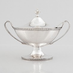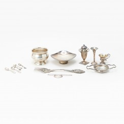 380032 - Солонка, Англия, 80 гр, 925 пр, высота 10 см, размеры верха горла 4 х 3,5 см 255104 - Емкость для сахарной пудры, г. Ханау, 238 гр, не ниже 800 пр, высота16 см, диаметр основания 15 см, диаметр горла 3,3 см 389867 - Серебряная ваза с крышкой, ковка. Швеция, 1927 год 295885 - Пара серебряных колец для салфеток. Европа 386242 - Серебряное кольцо для салфеток. Норвегия 378524 - Кружка с ситечком, 150 гр, 925 пр, высота 9 см, диаметр верха 7 см 279602 - Горчичница с кобальтовой вставкой, Англия, вес без стекла92 гр, 925 пр, высота 9,2 см, диаметр верха 4,5 см