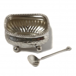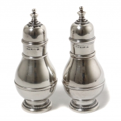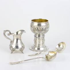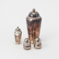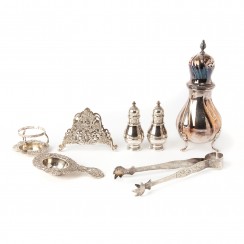 394103 - Серебряная ёмкость для сахарной пудры. Дания 216021 - Солонка и перечница, 70 гр, 830 пр, высота 9,5 см, диаметр основания2,8 см, диаметр верха горла 2 см 337762 - Серебряное ситечко для чая на подставке. Голландия/Швеция 324463 - Щипцы, Китай, 84 гр, 19,5 см 343125 - Подставка для салфеток, 54 гр, 835 пр, длина 11 см, ширина 2 см, высота 8,4 см