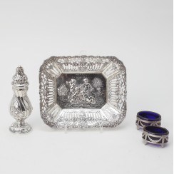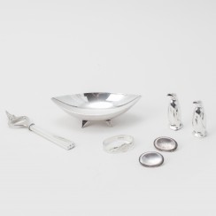 373083 - Ваза, 94 гр, 830 пр, длина 15 см, ширина 8,2 см, максимальная высота 4,7 см 285105 - Серебряное кольцо для салфеток. Норвегия 273477 - Солонка и перечница в виде фигур пингвинов, 51 гр, 925 пр, высота 6,7 см, основание 2,7 х 2,2 см 384188 - Открывалка для бутылок с серебряной ручкой. Швеция, 1957 год 315970 - Серебряные подсвечники, 2 шт. Швеция, 1958 год.