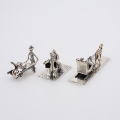 203817 - Серебряная миниатюра Мужчина с повозкой, 16 гр, длина 4 см, ширина 1,8 см, высота 3 см 322304 - Серебряная миниатюра Уличные артисты, 17 гр, 835 см, основание 4 х 2,9 см, высота 3 см 357006 - Серебряная миниатюра "Гужевая упряжка". Голландия