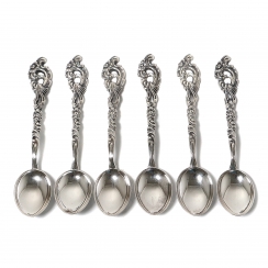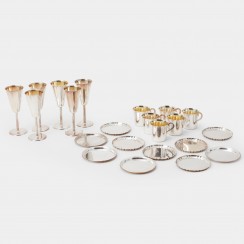 369503 - Рюмки, 6 шт, 288 гр, 830 пр, высота 12 см, диаметр основанияи4,7 см, диаметр верха 4,4 см 264707 - Подставки, 6 шт, 261 гр, 830 пр, диаметр 8 см 337516 - Серебряные подставки под стопки, 2 шт. Швеция 1962 год 313783 - Подставки, 2 шт, 61 гр, 830 пр, диаметр 8,2 см 309324 - Чарки, 6 шт, 185 гр, 830 пр, высота по край 4,5 см, диаметр верха 4,5 см